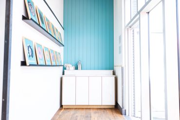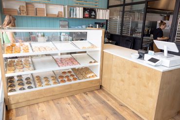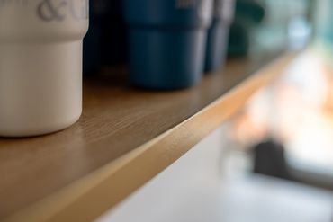 Variété d'items, et l'occasion de mettre en valeur plusieurs de nos compétences! En tant qu'ébéniste, nous sommes souvent associés au travail du bois et de ses dérivés, tels que les tables et les cuisines. Cependant, saviez-vous que nous sommes également à l'aise avec d'autres matériaux tels que le métal, le verre et les miroirs? Ces présentoirs et étagères en sont de parfaits exemples. Et que dire des comptoirs en surface solide? Ce matériau élégant offre une solution économique idéale pour les espaces commerciaux grâce à sa résistance aux bactéries et à son entretien facile. De plus, notre client a opté pour un magnifique look "terrazo" que nous adorons!